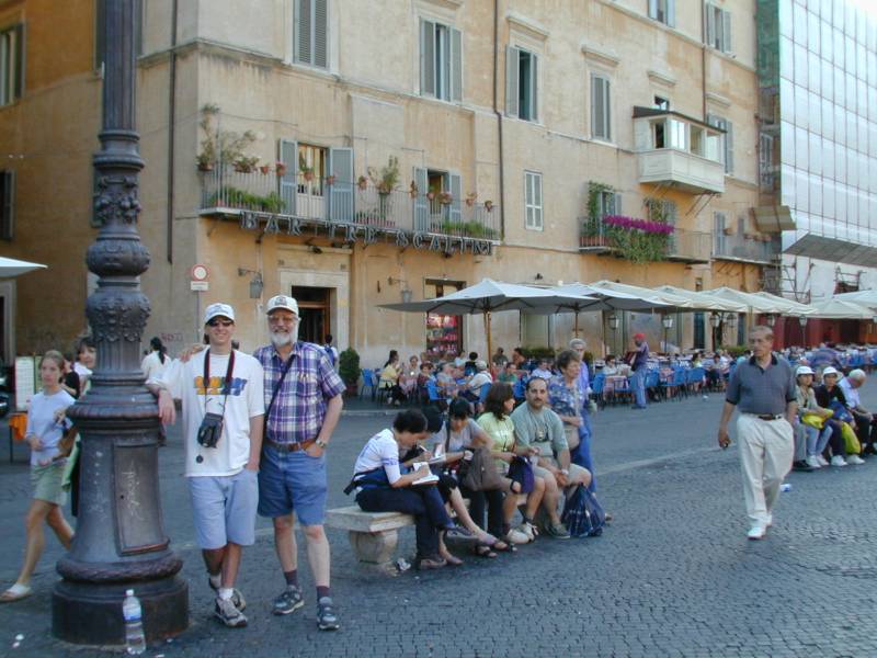 Joe & Dad in Piazza Navona with Bar Tre Scalini in the background in Rome.