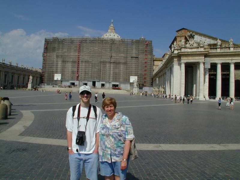Joe & Mom in Piazza San Pietro (Saint Peter's Square) with Basilica San Pietro (Saint Peter's Cathedral) in the background in the Vatican in Rome. Notice the lovely scaffolding!