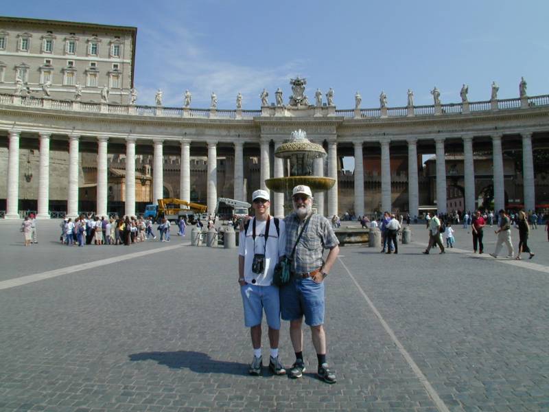 Joe & Mom in Saint Peter's Square in the Vatican in Rome, taken from the geometric center of the colonnade in the background. What looks like single columns, are actually 4 columns deep.
