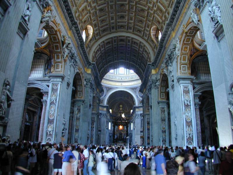 A view inside St. Peter's Cathedral looking from the rear towards the main altar.