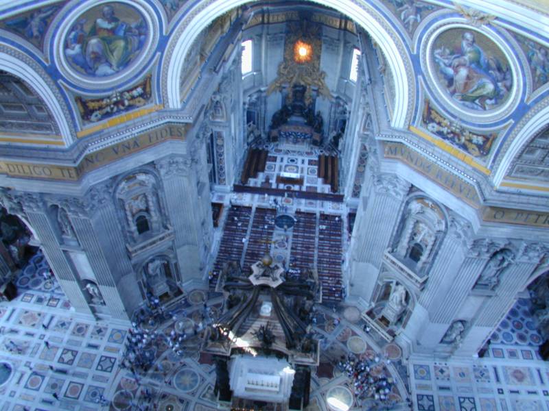 Looking down on the main altar of St. Peter's from inside the base of the dome. What appear to be paintings on the opposite side are actually mosaics!