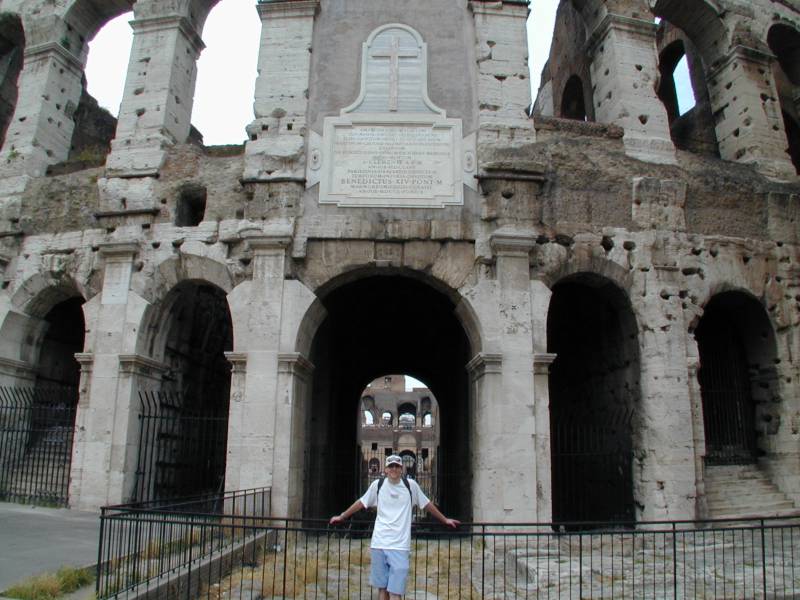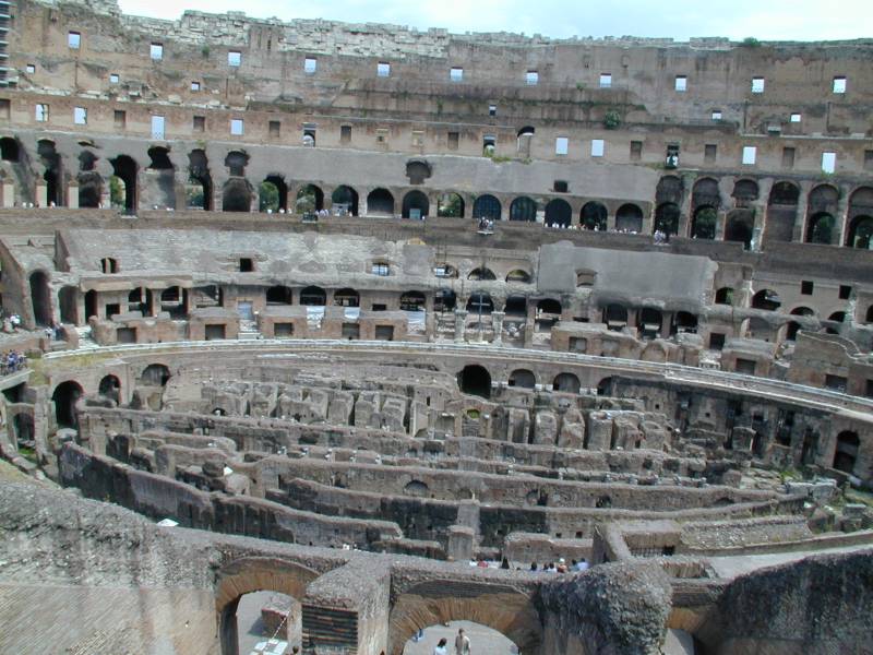 The inside of the Colosseum in Rome. The cross at the opposite end marks the spot where the emperor would sit.