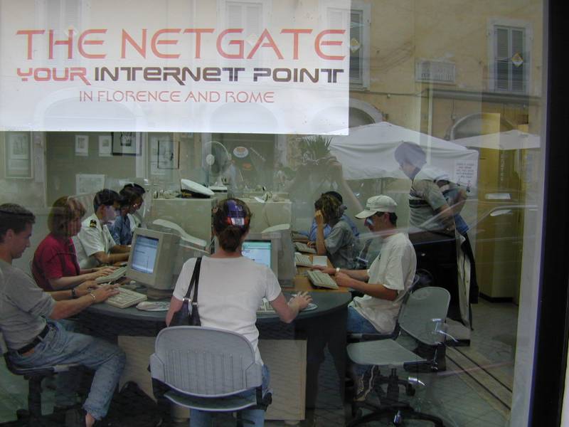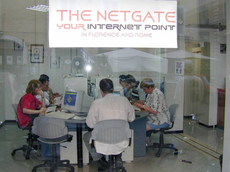 Joe writing emails to his friends from the Netgate in Piazza Firenze in Rome.