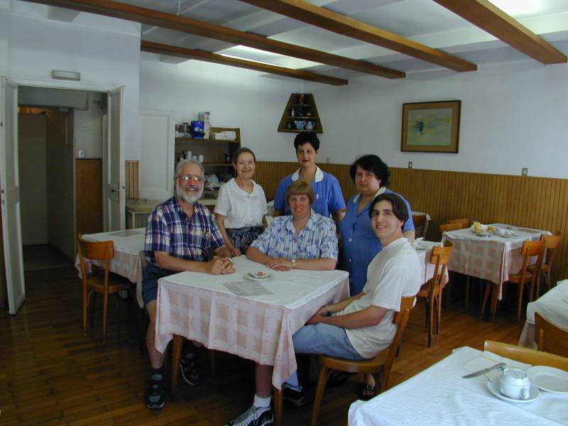 Dad, Mom & Joe with Mrs. Erdarelli and two of the staff in the breakfast room of Pensione Erdarelli in Rome.