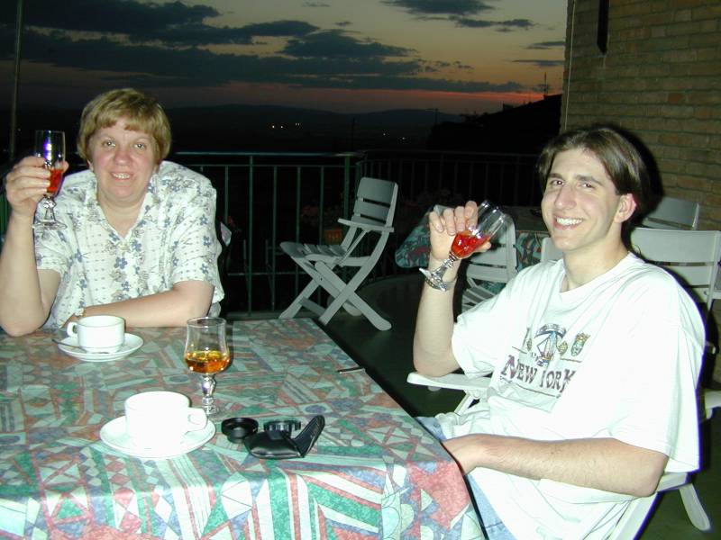 Mom & Joe enjoying an evening aperitif on the restaurant balcony of the Hotel Giotto in Assisi.