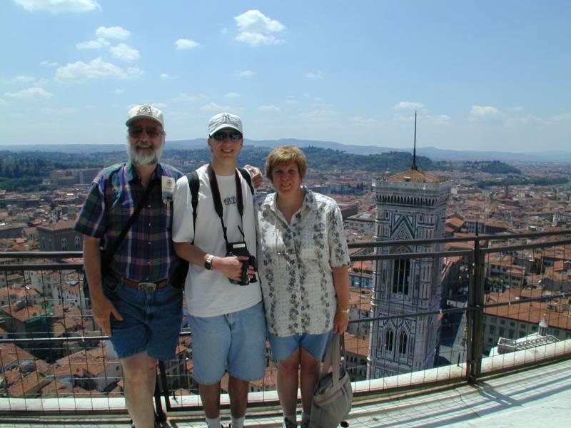 Dad, Joe & Mom and a view of the Duomo's bell tower and Florence from the cupola at the top of the dome. We climbed 459 steps to get up there.