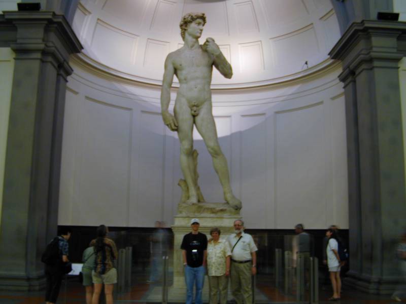Joe, Mom & Dad in front of the famous David, a sculpture by Michelangelo in the Academy of Fine Arts in Florence.