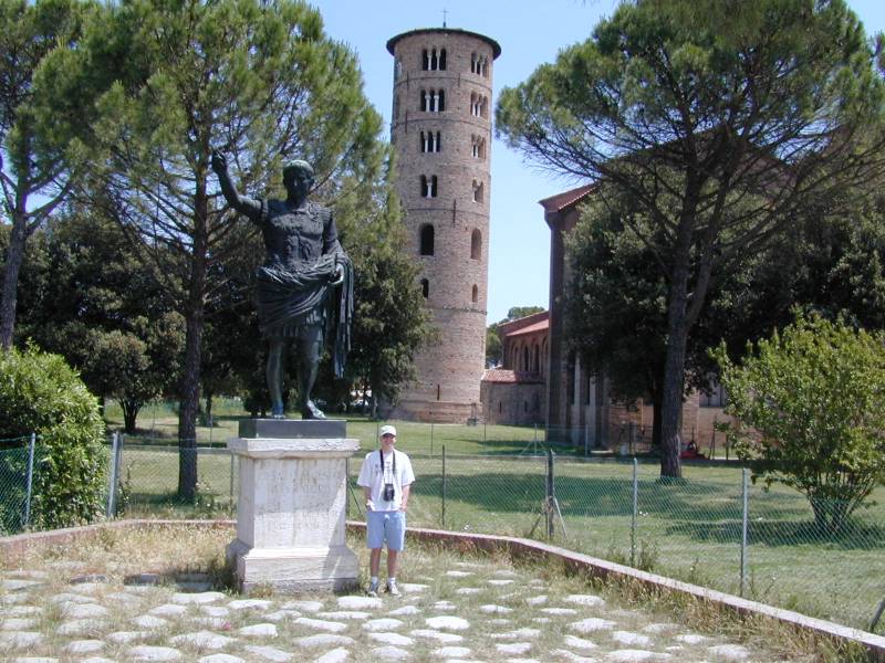 Joe in front of a statue of Caesar with the campanile (bell tower) of the Basilica of St. Apollinaris in Ravenna in the background.