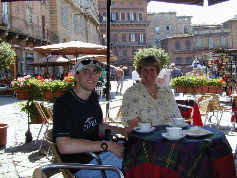 Joe & Mom having a pastry and cappuccino at a sidewalk cafe along the Piazza del Campo in Siena.