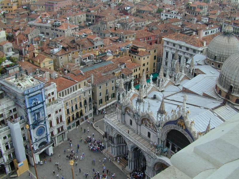 A view of the clock tower and the roof and domes of Basilica San Marco from atop the campanile (bell tower) of Piazza San Marco in Venice.