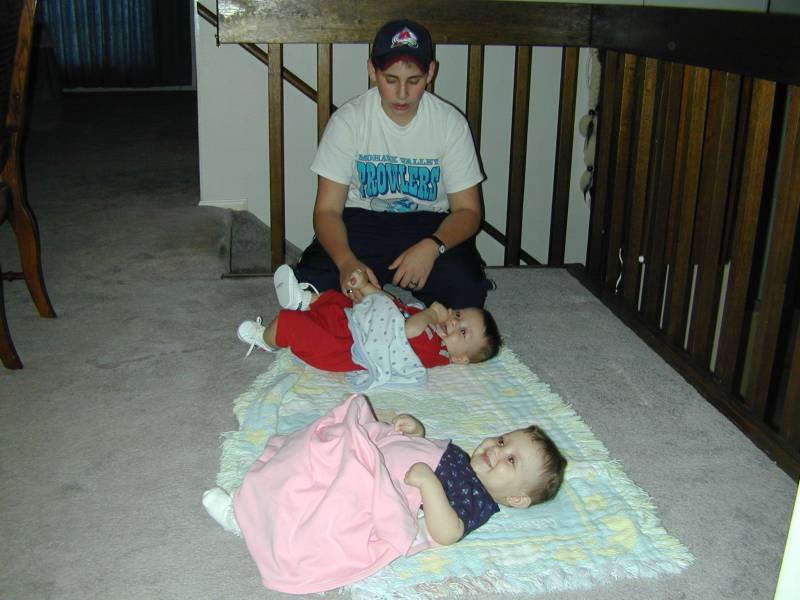![]() 2000/7/21 - RJ playing with the Nehme twins (5 months old): Salim and Gabrielle. |