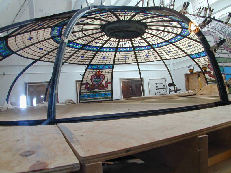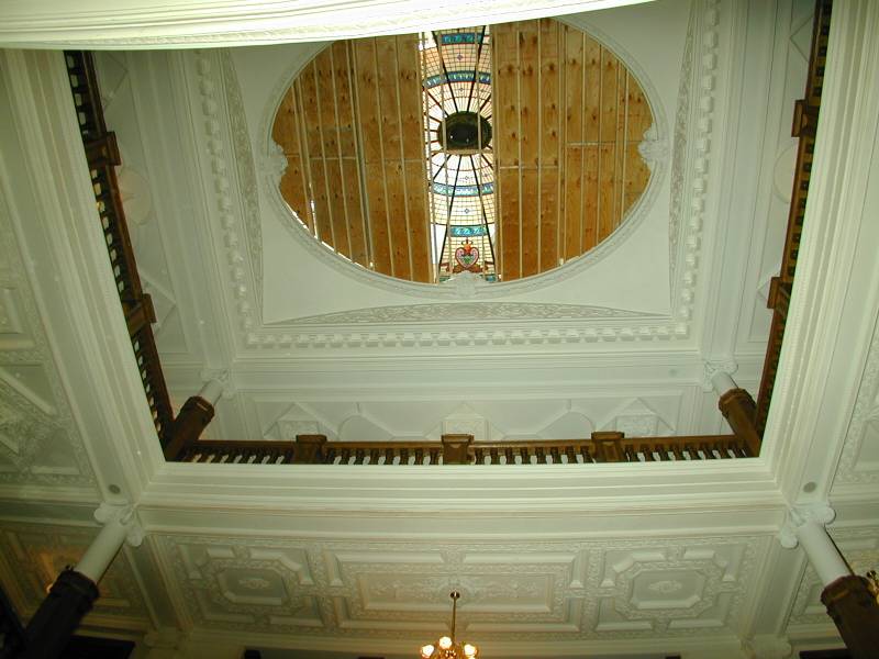 2001/5/28 - A view of stained glass skylight (still under reconstruction) looking up from the grand staircase inside Boldt Castle on Heart Island on the St. Lawrence River.