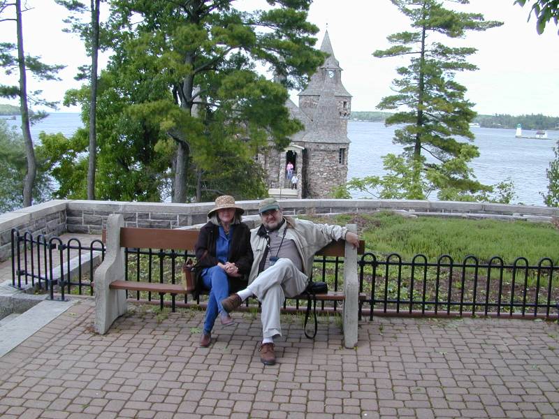 2001/5/28 - Joan & Al relaxing on a bench near the Italian Gardens of Boldt Castle with the Powerhouse in the background.